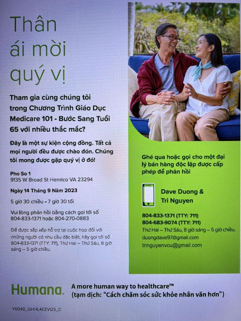 Xin thông báo với cô bác anh chị em có người trong gia đình đang ở độ tuổi 65. Hầu như ai đến tuổi 65 này cũng sẽ suy nghĩ đến chuyện về hưu, đặc biệt là Medicare rất là rườm rà khó hiểu. Vì vậy văn phòng bảo hiểm sức khỏe do anh Dave Dương (anh Dinh Insurance) và anh Trí Nguyễn sẽ đồng tổ chức một bữa hướng dẫn và trả lời những thắc mắc về những nhu cầu, điều kiện và quyền lợi của cô bác anh chị.