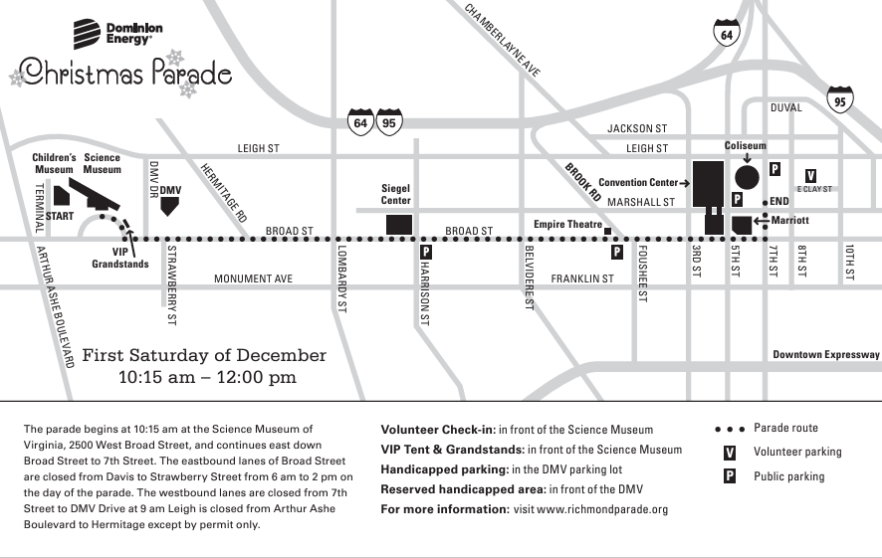 The Christmas Parade begins at the Science Museum of Virginia at 10:15 AM. Traveling eastbound on Broad Street, the parade will conclude at 7th Street near the Richmond Coliseum. The parade also airs LIVE on WTVR CBS6.