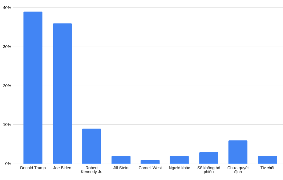 Cử tri ủng hộ Trump 39%, Biden 36% , Kenedy Jr. 9%, West 1% và Stein 2%