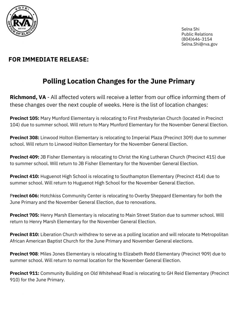 Dưới đây là Thông cáo báo chí chính thức về việc thay đổi địa điểm bỏ phiếu cho khu 106, 308, 409, 410, 606, 705, 810, 908 và 911 trong thành phố Richmond vào Thứ Ba ngày 18 tháng 6 năm 2024 từ 6 giờ sáng đến 7 giờ tối.