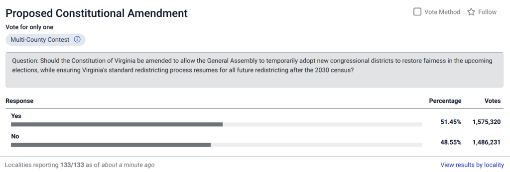 Question: Should the Constitution of Virginia be amended to allow the General Assembly to temporarily adopt new congressional districts to restore fairness in the upcoming elections, while ensuring Virginia’s standard redistricting process resumes for all future redistricting after the 2030 census?