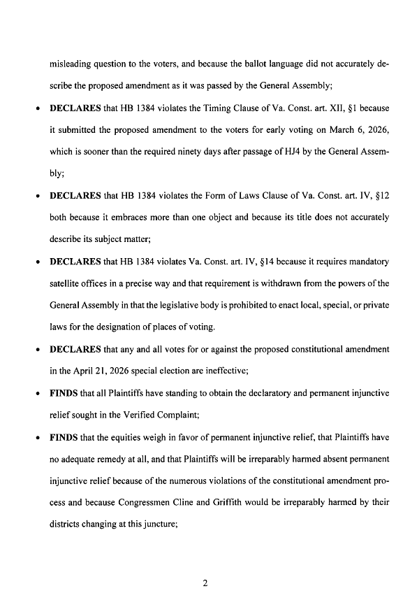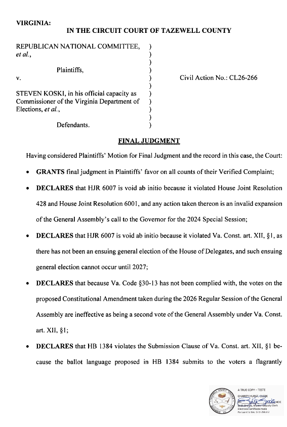 Theo nguồn tin trên trang mạng của Virginia Supreme Court https://www.vacourts.gov/ Post navigation Kết Quả Cuộc Bầu Cử Đặc Biệt Tu Chính Án Về Việc Chia Lại Khu Bầu Cử trong Tiểu Bang Virginia